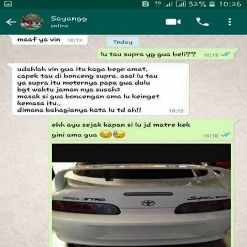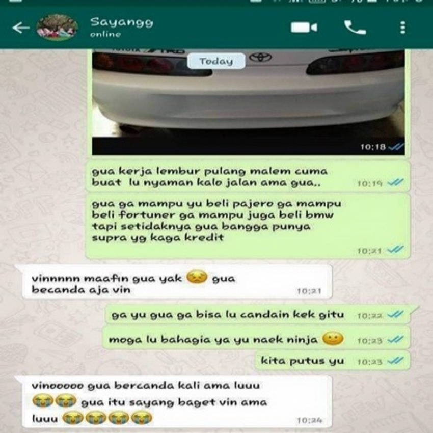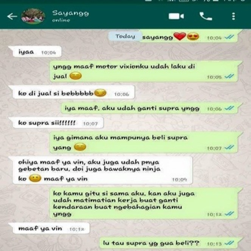 Mengetahui gambar yang dikirim kekasihnya adalah Mobil Toyota Supra, Ayu langsung meminta maaf. Ia mengaku hanya bercanda tentang gebetan. Vino yang nampaknya telah sakit hati terhadap apa yang dilakukan Ayu, tak bisa begitu saja menerima bahwa semua itu hanya bercanda. Vino pun mengakhiri chat dengan mendoakan agar Ayu bahagia saat nanti naik Ninja, dan memutuskan hubungan mereka. Ayu masih berusaha menjelaskan bahwa dirinya hanya bercanda dan mengaku masih sangat sayang pada Vino. Namun, pesan itu nampaknya tak lagi berbalas.
