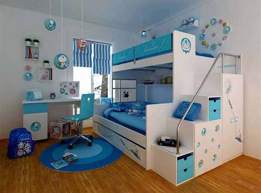 Desain kamar tidur unik penggemar Doraemon yang bernuasa biru bisa menjadikan suasana kamar