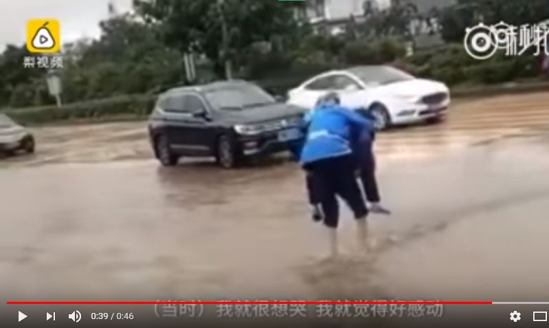 Dalam video yang merekam aksi keduanya, terlihat si kakek menggendong istrinya di punggungnya melewati jalanan yang banjir dan berlumpur.