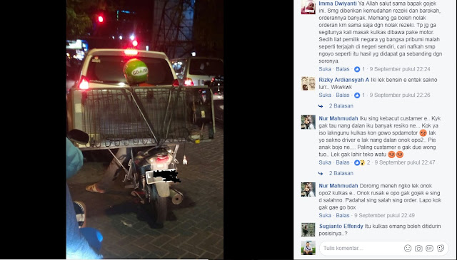 Lain kali bagi customer yang order minta anterin barang yang tidak mungkin diangkut motor lebih baik order yang memang khusus nganter barang-barang berat, kalo gini kan yang kasihan driver ojek itu membahayakan nyawanya juga istri dan anaknya menanti dirumah.