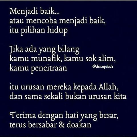 Sekalipun kamu menjadi orang yang baik, akan selalu ada yang mengatakan bahwa kamu sok baik, tapi tidak perlu mendengarkan hal itu. Yang harus kamu lakukan tetap menjadi baik, tak perlu mengubris semua perkataan orang terhadapmu. Karena sebaik apapun kamu, akan selalu ada yang tidak menyukaimu dan akan selalu ada yang membencimu.