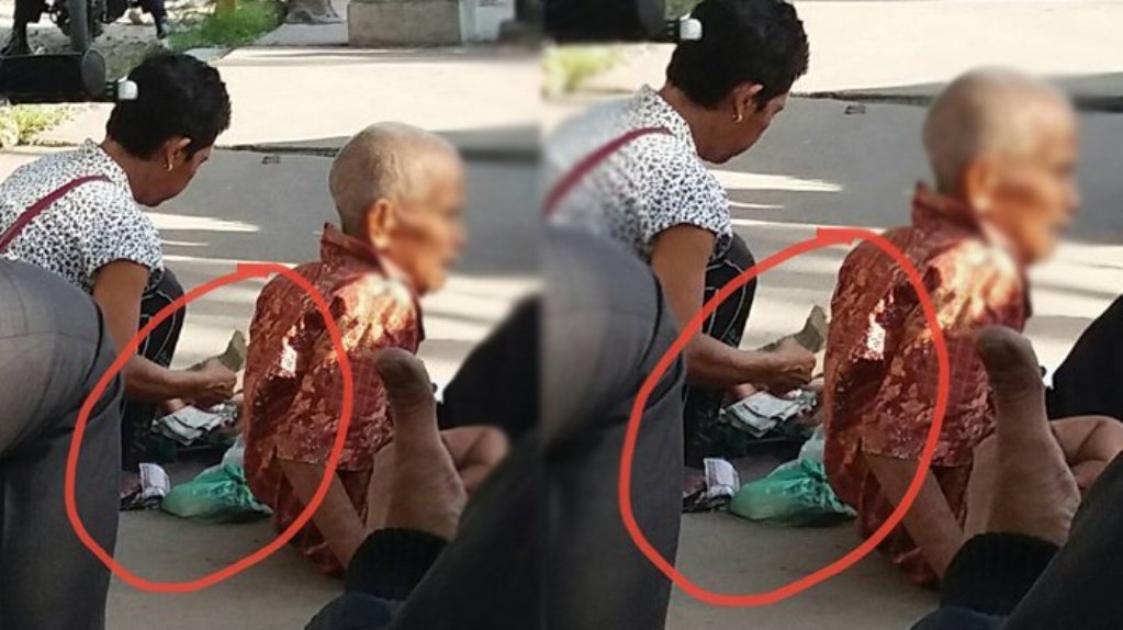 Yang lebih parahnya lagi, wanita yang kondisinya masih sehat itu pun malah menghitung uang di samping pria tua yang sedang mengemis.