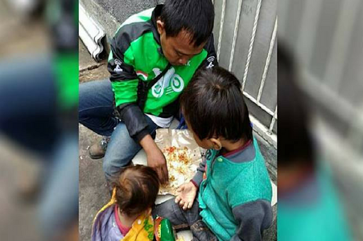 Dalam postingan tampak dua foto turut dibagikan. Satu foto memperlihatkan lelaki berjaket ojek online duduk berhadap-hadapan dengan dua bocah yang masih sangat kecil.