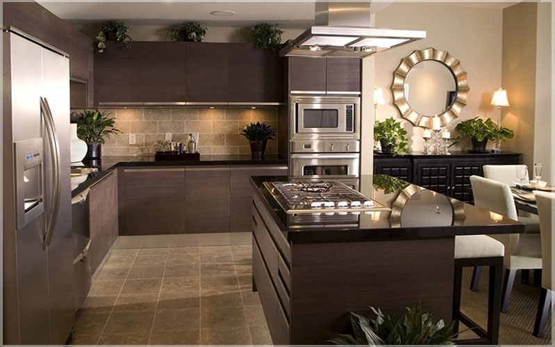 Inspirasi Dapur Mewah Yang Elegan Tentunya Banyak Digemari Orang, Karena memiliki warna yang gelap. Dan di dalam dapur ada perabotan seperti kulkas, kursi, meja makan,oven, dan lain-lain.