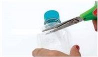 Langkah pertama , potong atas ujung tutup botol menggunakan gunting . Potonglah secara perlahan dan potonglah mengeliling botol tersebut .