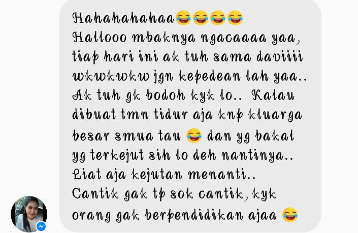 Sudah tidur bareng apa itu yang sudah cukup membanggakan bagimu? merebut kebahagiaan orang kok bangga, merasa suami dari istri sah lebih memilih kamu gitu saja sudah besar kepala, sekarang bangga coba saja nanti diakhirat..
