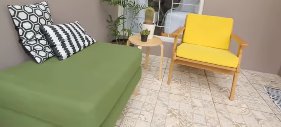 Ditengah-tengah kursi terdapat meja berbentuk bulat dan diatasnya dihiasi dengan kaktus dan dibelakangnya terdapat tumbuhan.