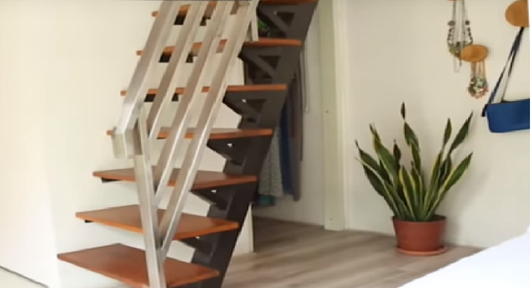Tangga ini sangat simple dan natural karena tangga ini terbuat dari kayu. Disekitar tangga terdapat bunga dan diatas bunga tersebut ada tanaman yang menggantung kebawah.