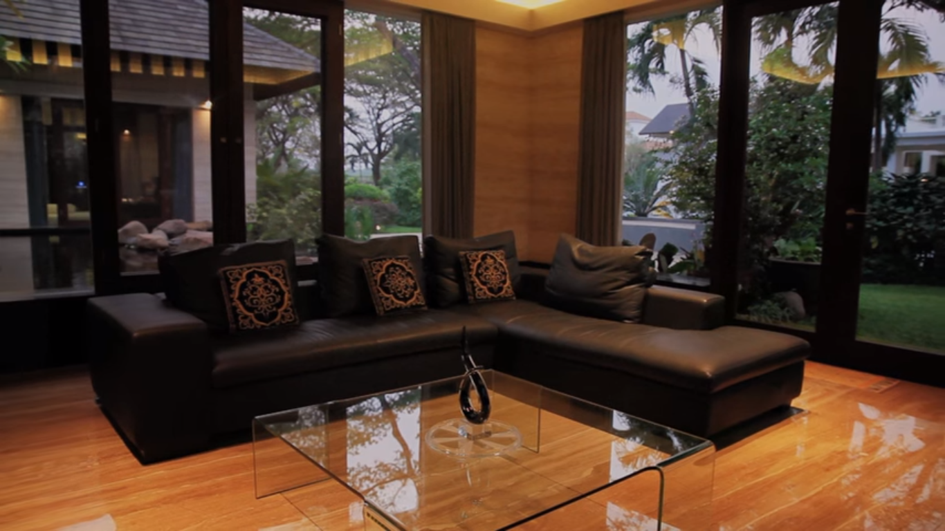Rung tamu yang dikelilingi kaca besar ini dapat menambah suasana segar pada pemandangan diluar rumah. Dengan penambahan sofa warna hitam dan meja kaca tentunya sangat terlihat indah dan menarik.