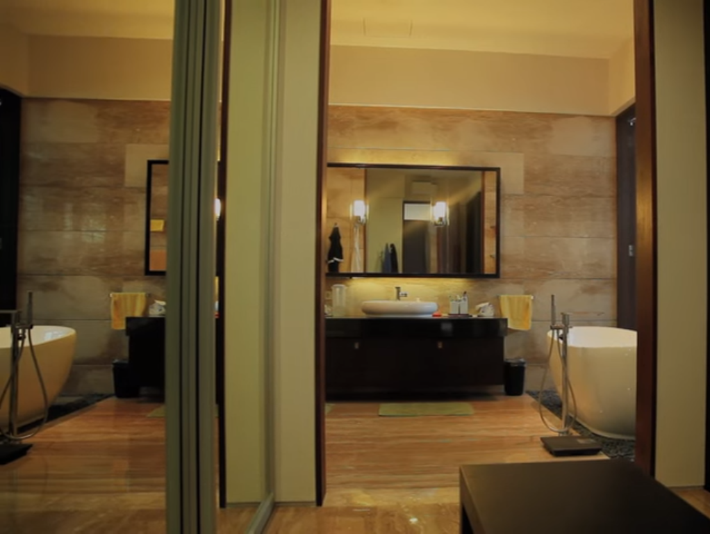Pada kamar mandi salah satunya juga menyangkut dengan kebersihan. Kamar mandi ini ditata dengan meletakkan kaca besar di dinding agar terkesan lebih luas.