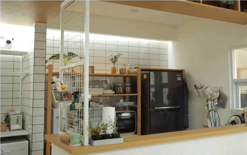 Pada desain dapur ini memilih rak terbuka sebagai pengganti kabinet untuk mengurangi space yang terpakai.