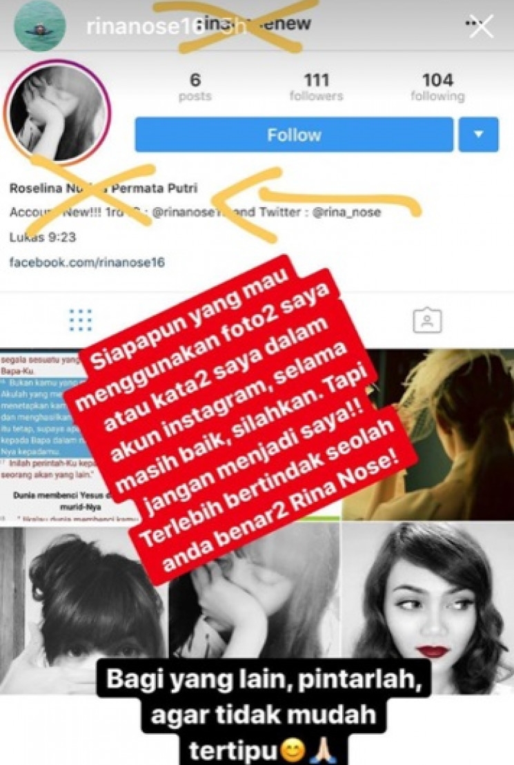 Namun pada Minggu (19/11/2017) kemarin, Rina Nose melalui akun Instagramnya langsung memberikan klarifikasi bahwa akun tersebut palsu.