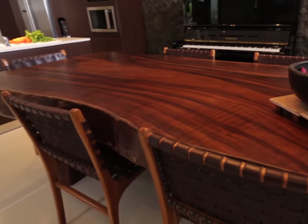 Material meja makan yang menggunakan potongan bongkan kayu yang di furnish teras alami.