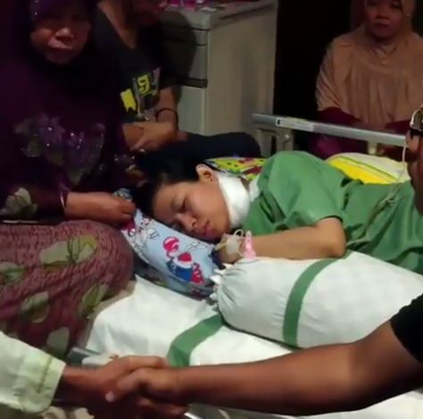 Jarum dan selang infus juga masih melekat di tangan kiri wanita tersebut.
