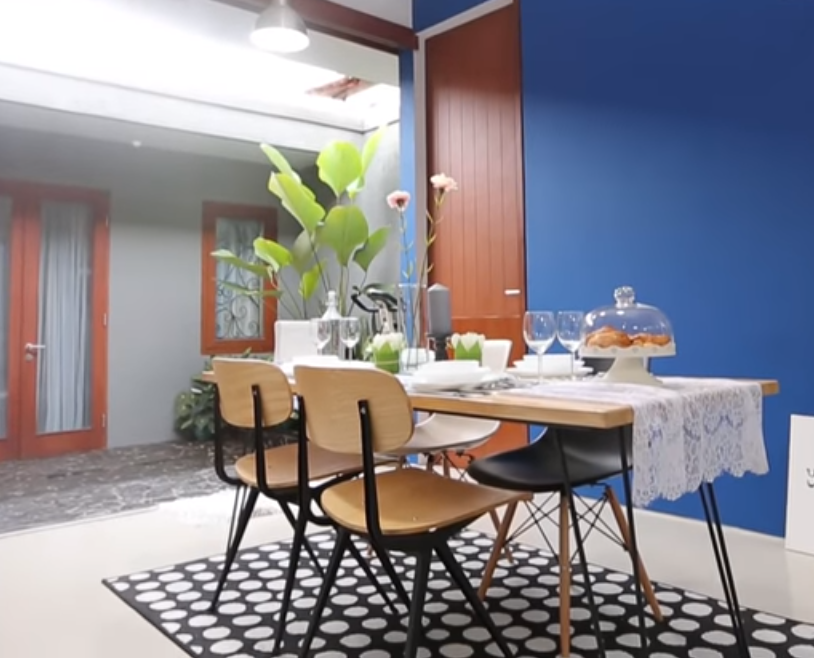 Area ruang makan ini, didesain dengan warna dinding yang sedikit menonjol karena pemilik rumah saat itu sedang menyukai warna biru tua ini.