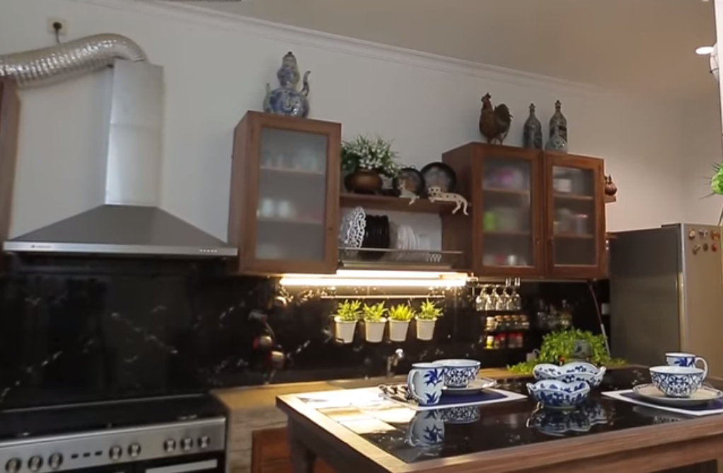 Didapur ini juga terdapat mini bar untuk dimanfaatkan minum kopi sambil bersantai. Meja yang dipilih dengan material kayunya dan bagian atas meja terbuat dari marmer dan itu tampak serasi.