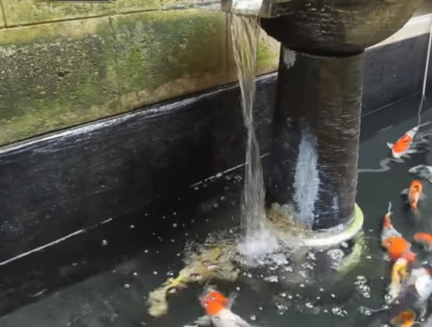Kolam ikan ini didesain cukup simple dan materialnya terbuat dari batu expose dan diatasnya terdapat air mancur.