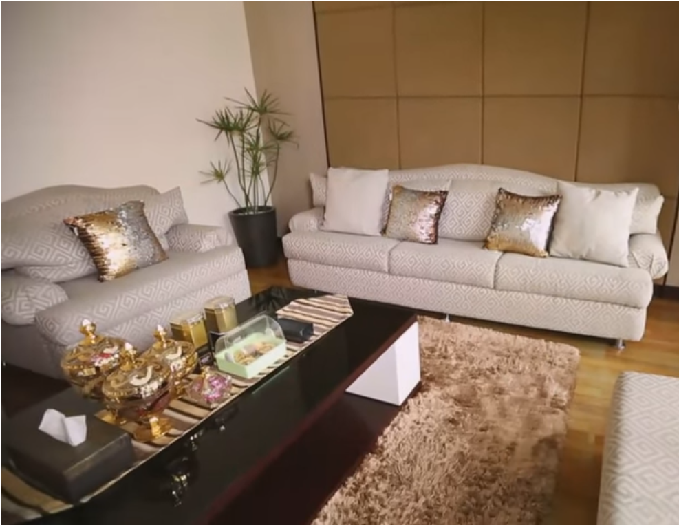 Meja yang dilapisi dengan kaca dan di tambahkan dengan toples yang berwarna emas akan terlihat mewah. Karpet yang berbuhu akan membuat anda merasa hangat jika didalam ruang tamu.