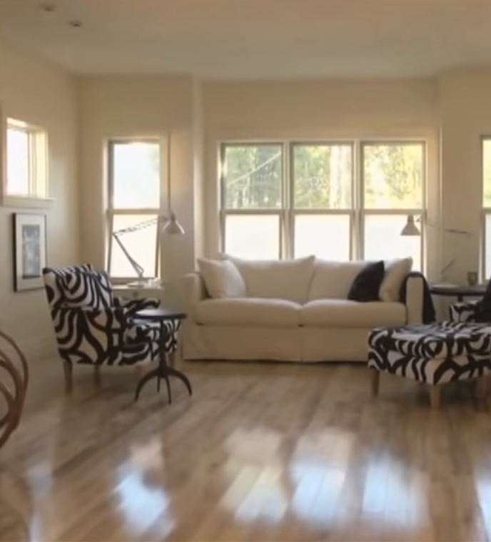 Ruang tamu ini begitu luas dengan nuansa cat warna putih. Dengan sofa panjang warna putih dan 2 sofa motif zeba. Lantai pada ruang tamu ini di desain motif kayu.