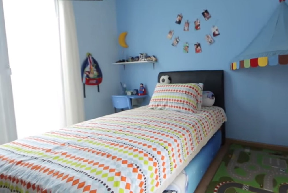 Kamar tidur anak yang menggunakan bedcover bermotif ketupat ini sangat hangat untuk menemani tidur sikecil.
