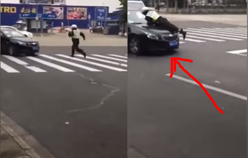 Penertiban lalu lintas kerab dilakukan untuk tetap menjaga kemananan berlalu lintas. Namun saat seorang polisi di Shanghai, China hendak melaksanakan tugasnya, seorang pengendara menolak untuk bekerja sama dengan baik.