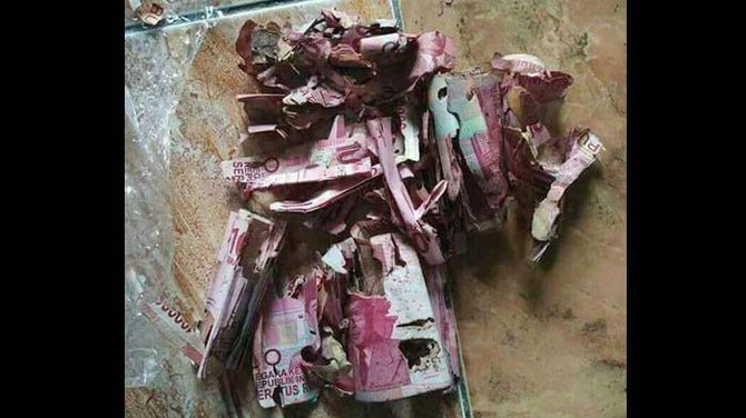 Dalam foto tersebut terlihat uang pecahan Rp 100 ribu sudah tidak berbentuk seperti awalnya, usut punya usut ternyata uang tersebut dimakan rayap.