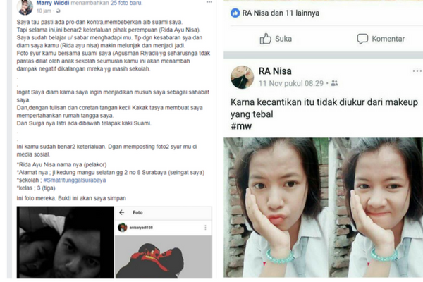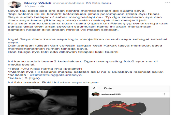 Akun Facebook Marry Widdi , Rabu (09/12/2017) membagikan kisah rumah tangganya yang hancur setelah suaminya jatuh ke tangan wanita lain yang ternyata masih duduk di bangku SMA.