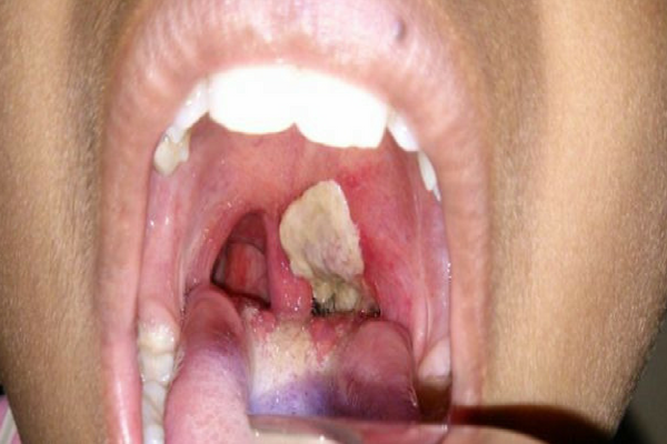 Adapun gejala dan tandanya berupa demam yang tidak begitu tinggi, 38ºC, munculnya selaput di tenggorokan berwarna putih keabu-abuan yang mudah berdarah jika dilepas, sakit saat menelan, adakalanya diikuti sesak napas dan suara mengorok.