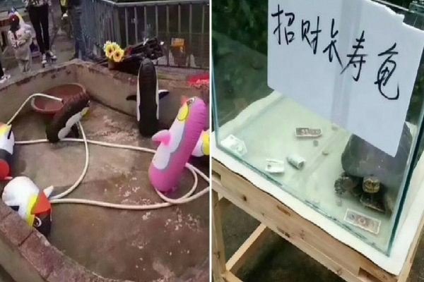 Kura-kura itu ditaruh di dalam kotak kaca dengan lubang di atasnya dan kemudian diberi tulisan 'Inilah Kura-kura Keberuntungan'.