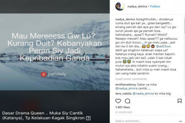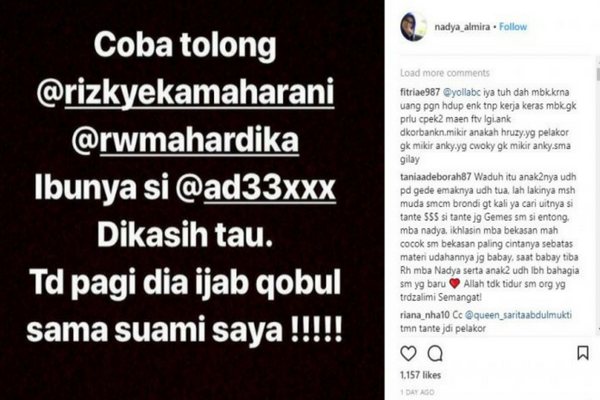 Postingan itu sontak membuat netizen mencari tahu siapa gerangan wanita yang telah menikah dengan suami Nadya.