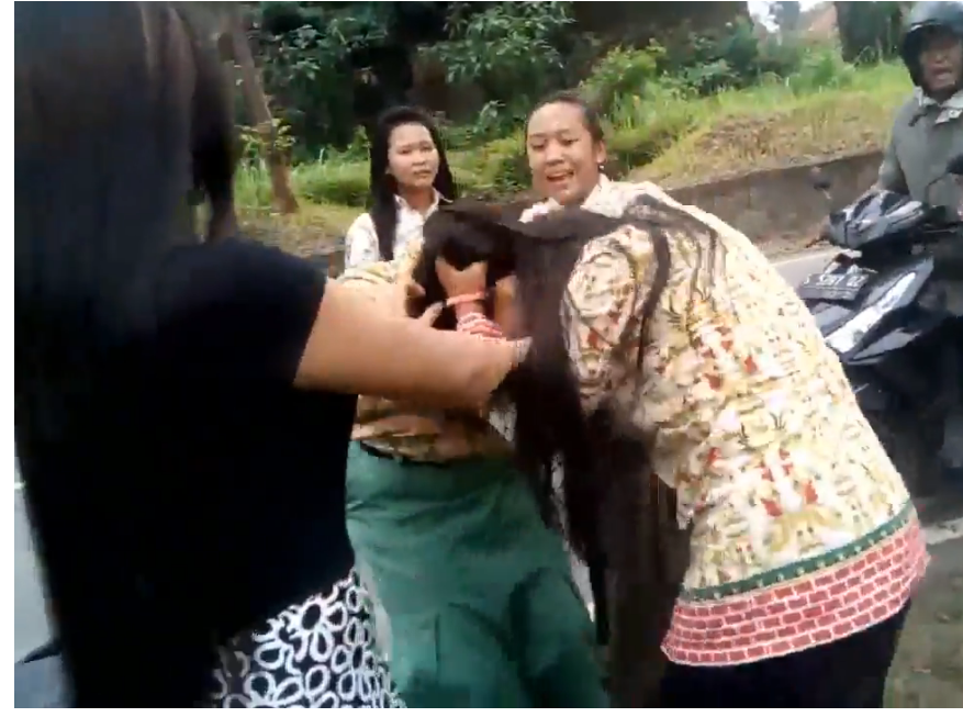 Dalam rekaman video ini, tampak dua pelajar perempuan diduga dari sekolah tingkat SMP dan SMA di wilayah Kecamatan Kutorejo berkelahi.