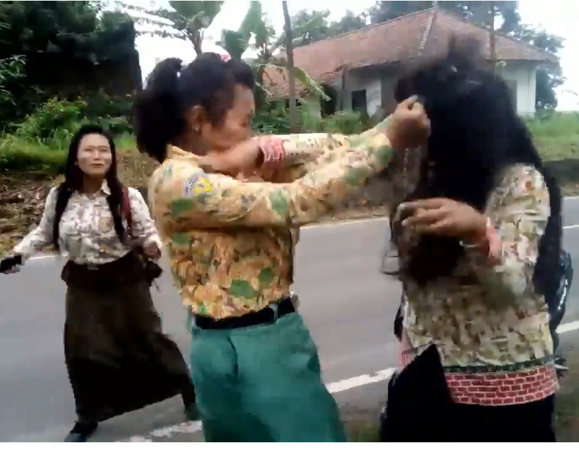 Namun, saat mereka berseturu fisik dan mulut, tampak di sekitar mereka ada dua orang pelajar perempuan lain, satu perempuan dan bocah.