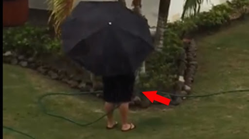 Rekaman ini menunjukan seseorang membawa payung hitam asyik menyirami tanaman di tengah guyuran hujan.