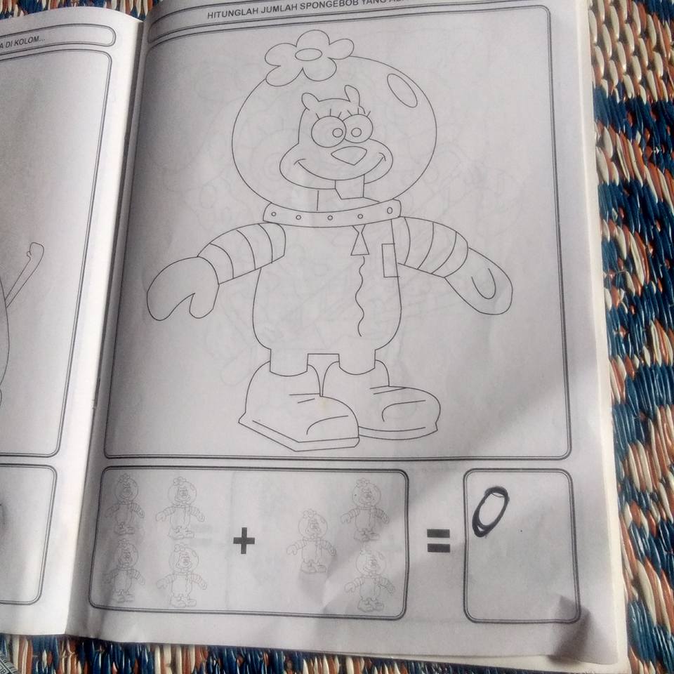 Soal itu menunjukan soal penjumlahan '4 + 3" dengan wujud boneka Sandy -tokoh tupai di kartun SpongeBob-.
