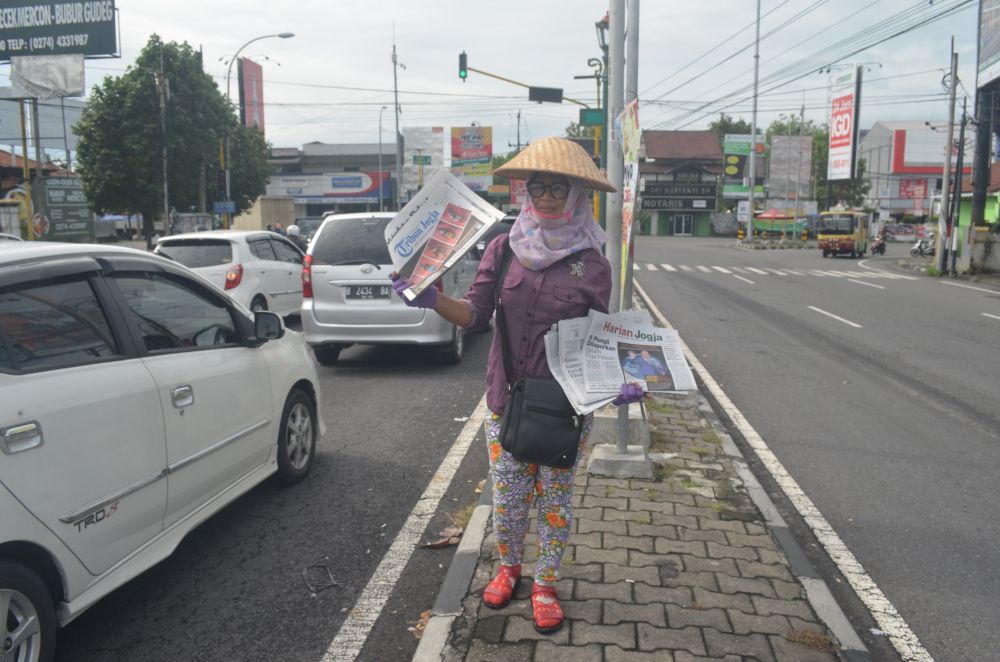 Sambil setengah berteriak "Pak korannya pak, koran, koran, 2000 saja," Hani menjajakan dagangan korannya ke setiap pengendara motor dan mobil di pertigaan Jalan Solo Yogyakarta.