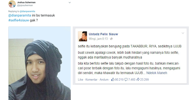 Menanggapi pernyataan Felix, Joshua yg bukan muslimah, bahkan muslim juga bukan mengunggah dirinya pakai kerudung yang biasa dipakai muslimah.