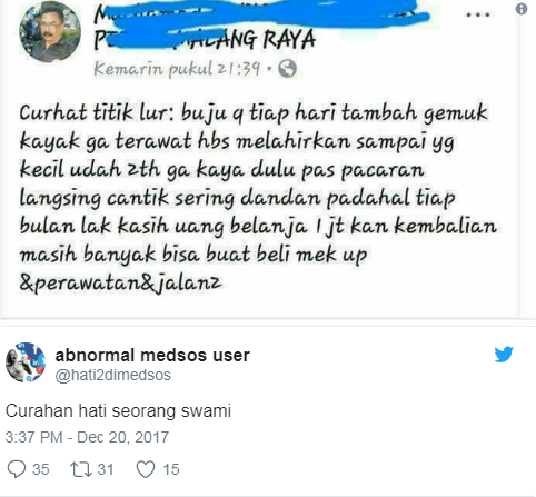 Curahan hati seorang swami pic.twitter.com/vqZsLVEWV5— abnormal medsos user (@hati2dimedsos) December 20, 2017