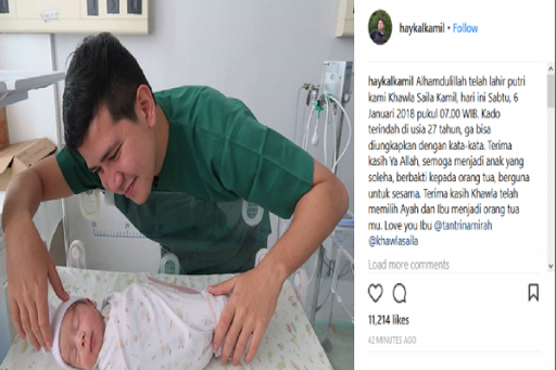 "Alhamdulillah telah lahir putri kami Khawla Saila Kamil, hari ini Sabtu, 6 Januari 2018 pukul 07.00 WIB. Kado terindah di usia 27 tahun, ga bisa diungkapkan dengan kata-kata. Terima kasih Ya Allah, semoga menjadi anak yang soleha,