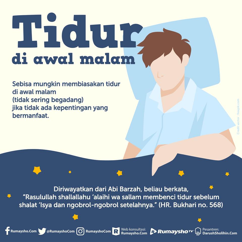 Sebisa mungkin membiasakan tidur di awal malam (tidak sering begadang) jika tidak ada kepentingan yang bermanfaat.