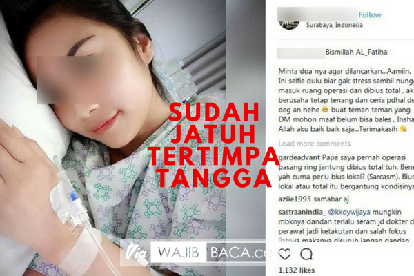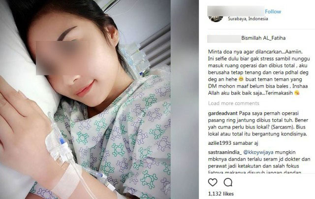 "Bismillah AL_Fatiha. Minta doanya agar dilancarkan. Amiin. Ini selfie dulu biar enggak stres sambil nunggu masuk ruang operasi dan dibius total. Aku berusaha tetap tenang dan ceria padahal deg-deg an hehe (emoji) buat teman teman yang DM mohon maaf belum bisa bales. Insha Allah aku baik baik saja. Terima kasih (emoji)," tulis korban di akun Instagram-nya.