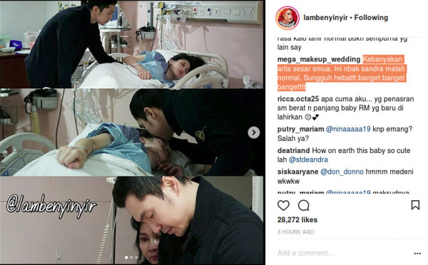 "Cerita mbak Sandew tentang proses persalinan si ganteng baby RM," tulis akun lambenyinyir yang dikutip dari aura.tabloidbintang.com.