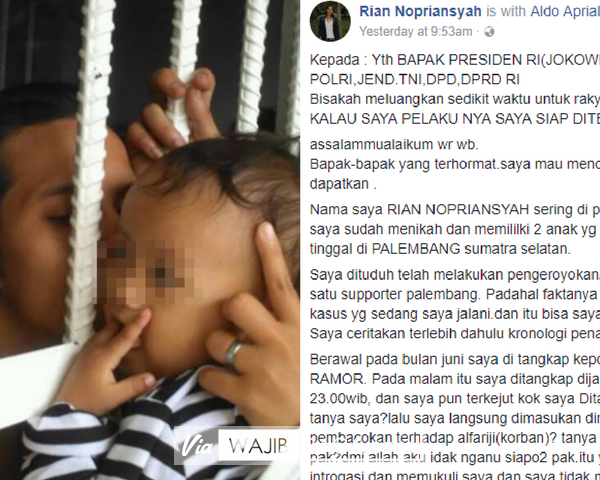 Baru baru ini pengguna facebook dihebohkan oleh surat terbuka kepada Presiden dan jajaran hukum pemerintah. Surat itu di buat oleh akun Rian Nopriansyah, yang meminta keadilan hukum karena dirinya merasa di fitnah dan di zolimi.