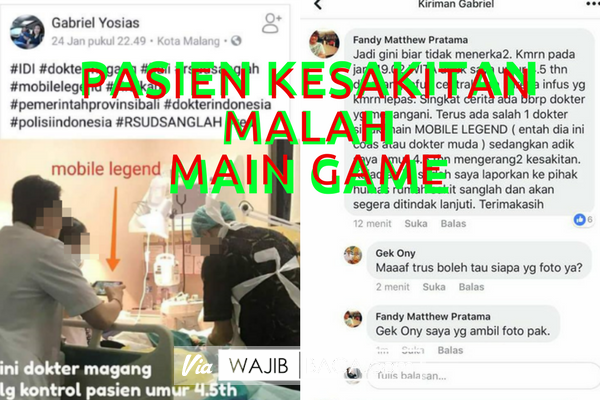 Dalam unggahan foto tersebut tertulis."Ini dokter magang lg kontrol pasien umur 4.5th. Pasien lagi kesakitan, dia asik main game," begitu keterangan pada foto yang diposting Gabriel, Rabu (24/1/2018) malam.
