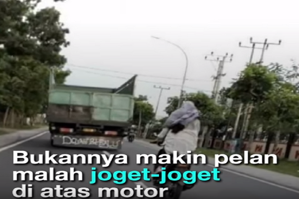 Namun, tampaknya wanita tersebut tidak begitu menggubrisnya. Ia justru beraksi semakin ugal-ugalan dengan berjoget-joget di atas sepeda motor dan menyalip kendaraan di depannya.