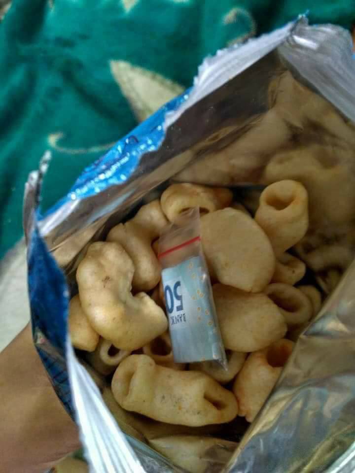 Selain itu ada juga sejumlah uang yang dibungkus plastik dan dimasukkan ke dalam kemasan snack tersebut.