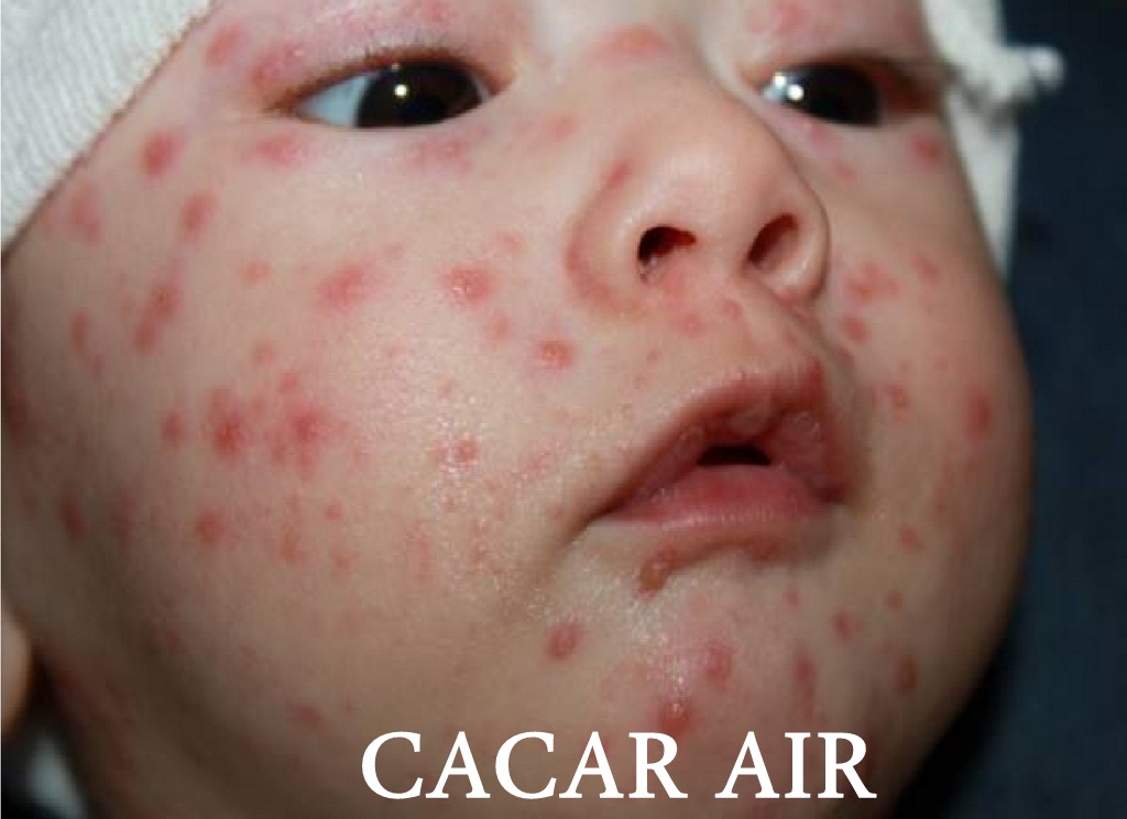 Lebih berbahaya lagi, cacar air ini dapat menyebar dengan mudah melalui udara ketika seorang penderita cacar air batuk atau bersin, dimana tetesan-tetesan kecil cairan yang keluar mengandung virus. Jadi penularannya mirip penyakit flu yang sama-sama disebabkan oleh virus. Dapat dibayangkan bila penderita cacar air mencium si kecil, virusnya pun akan turut berpindah, sehingga menyebabkan si kecil sakit cacar..
