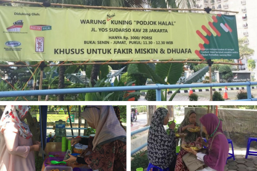 Spanduk berwarna hijau kuning terpampang di pinggir Jalan Yos Sudarso kav 28, Jakarta Utara. Di sana tertulis "Warung Nasi Kuning Podjok Halal, Khusus untuk Fakir Miskin dan Duafa.
