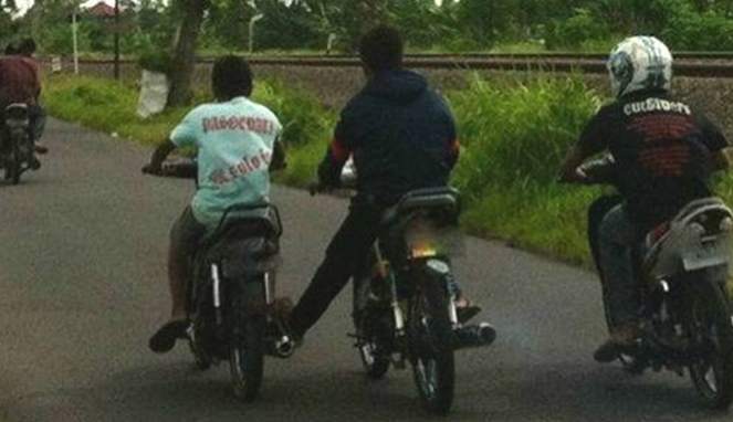 Oleh karena itu, sekarang ada peraturan jika ketahuan mendorong motor menggunakan transportasi roda dua lain akan dikenakan sanksi.
