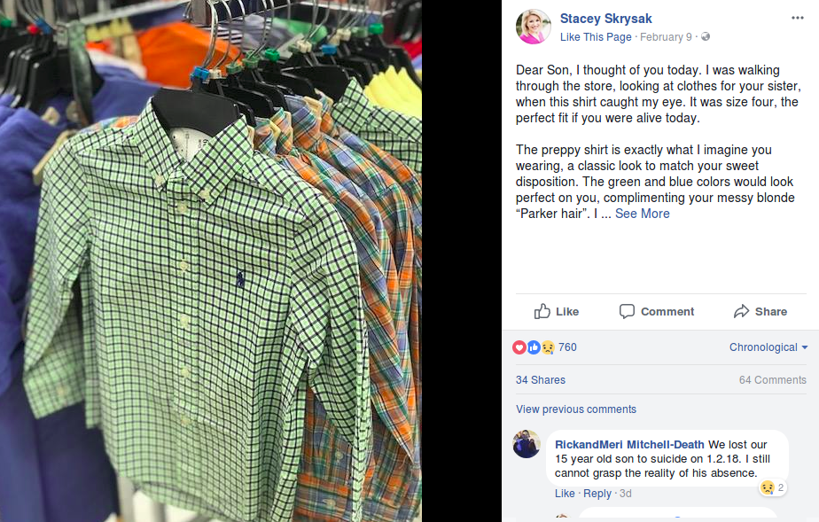 Dalam halaman Facebook-nya, Stacey menuliskan ketika dia nggak sengaja melihat kemeja ukuran anak 4 tahunan, lantas ia teringat pada Parker.