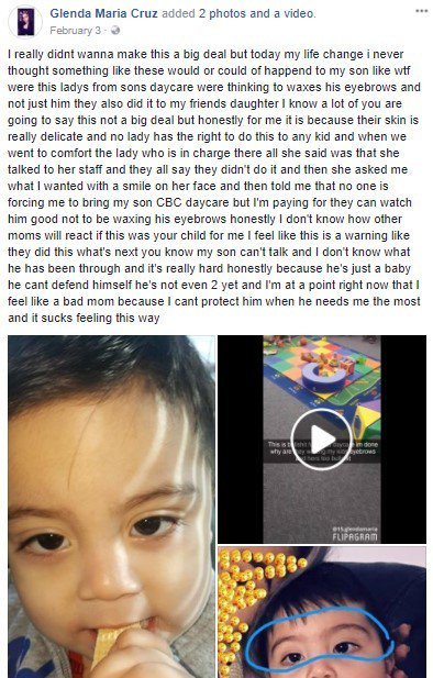 Glenda Maria Cruz membagikan pengalamannya di Facebook bahwa anak laki-lakinya yang berusia 1 tahun mengalami hal yang sama. Staf daycare berpikir bahwa alis sang anak sebaiknya dicukur.
